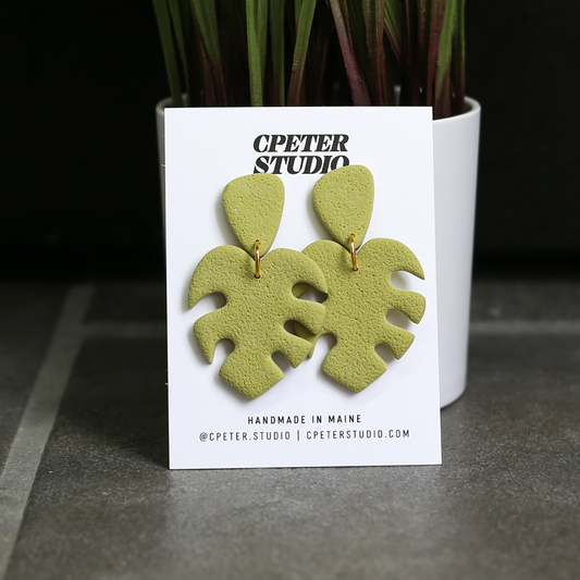 Monstera Leaf Statement Earrings – Textured Olive Green