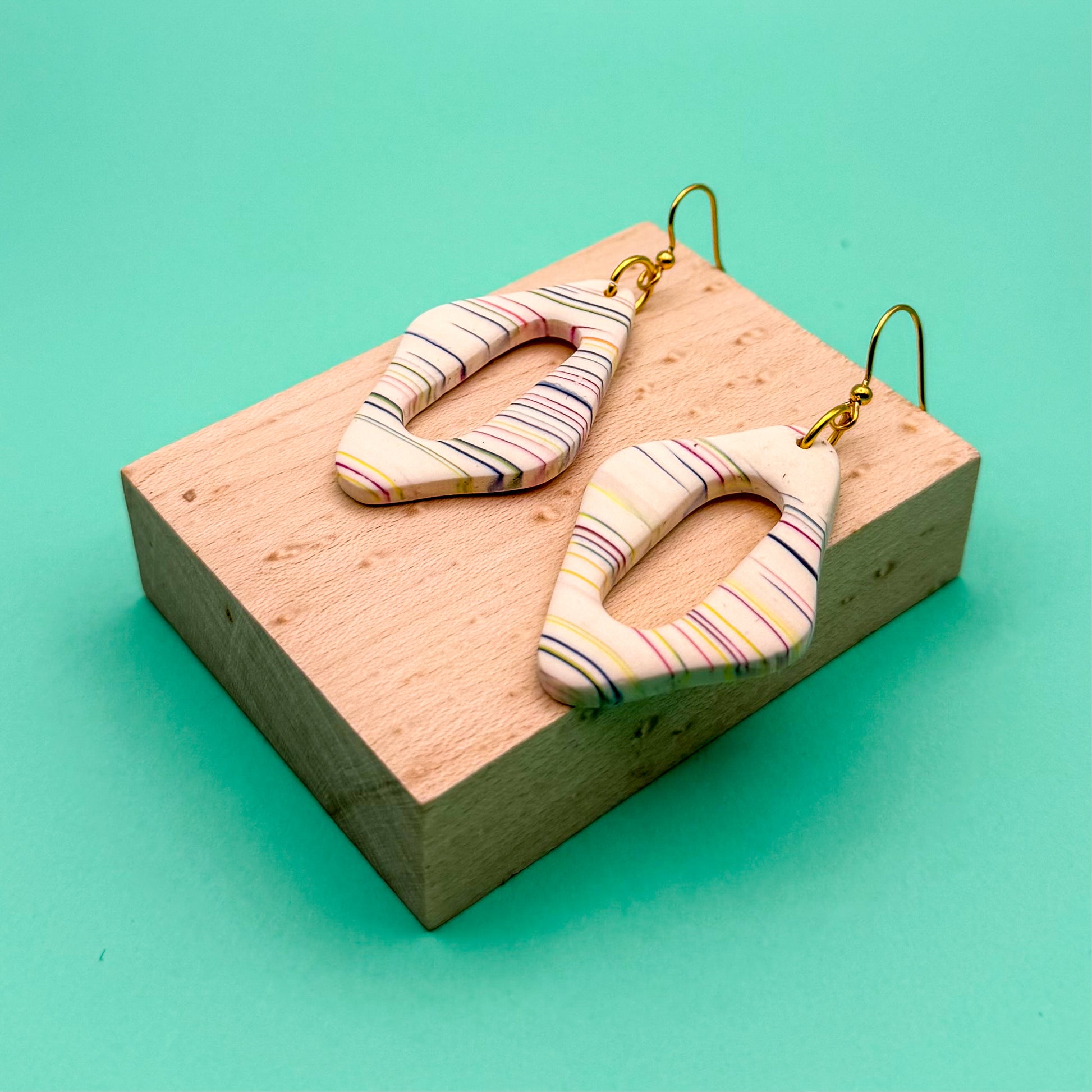These Arch Drop Earrings feature a modern cutout silhouette in a soft cream clay, accented with thin multicolored linework that creates a playful, hand-drawn like pattern. Lightweight and full of movement, they bring a bold yet whimsical touch to any outfit.